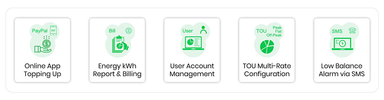 Acrel IoT EMS বিলিং সলিউশনে, সুবিধা পরিচালকরা পিক, অফ-পিক এবং ফ্ল্যাট TOU শুল্ক সেট করে, প্রিপেইড বা পোস্ট-পেইড মোডগুলি প্রয়োগ করে এবং কম-ব্যালেন্স থ্রেশহোল্ডগুলি সংজ্ঞায়িত করে। পেপ্যাল, ক্রেডিট কার্ড বা মোবাইল অ্যাপের মাধ্যমে ব্যবহারকারীরা টপ-আপ করে; প্ল্যাটফর্মটি স্বয়ংক্রিয়ভাবে এসএমএস অ্যালার্ম পাঠায়, পিডিএফ বিল ইস্যু করে এবং শূন্য ক্রেডিটে দূরবর্তী সংযোগ বিচ্ছিন্ন করার সময়সূচী করে। রিয়েল-টাইম ড্যাশবোর্ড, ভাড়াটে সাব-মিটারিং, এবং কনফিগারযোগ্য শক্তি রিপোর্ট ESG সম্মতি এবং খরচ বরাদ্দকে সহজ করে।