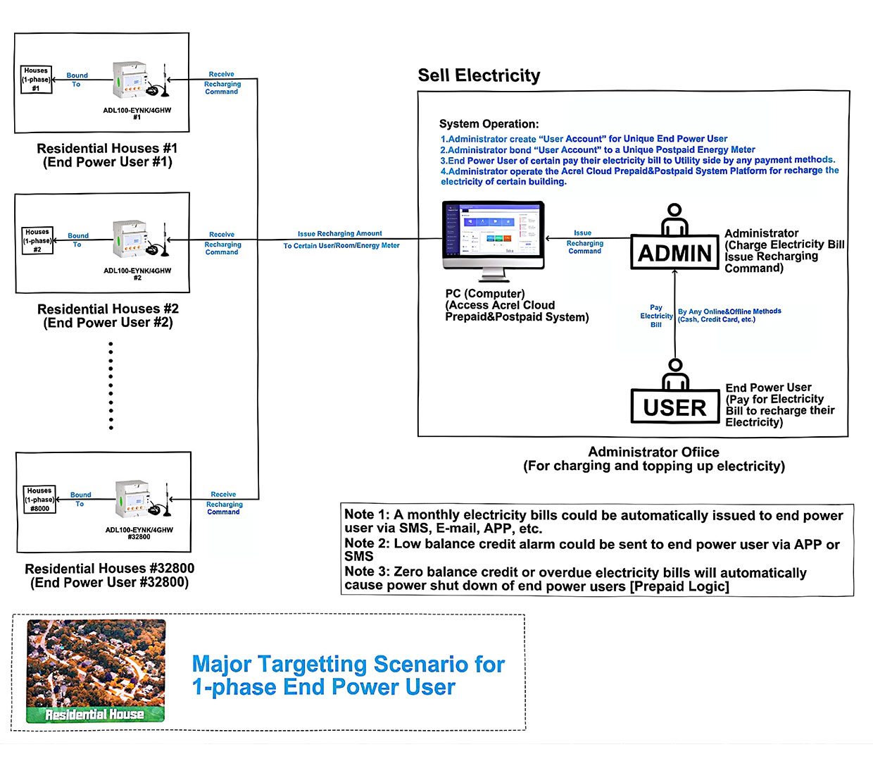 একরেল এন্ড-টু-এন্ড প্রিপেইড/পোস্টপেইড বিলিং সিস্টেমটি স্কুলের ছাত্রাবাস, শপিং মল, শিল্প পার্ক এবং আবাসিক এস্টেটের জন্য নির্মিত। থ্রি-লেয়ার আর্কিটেকচার ADL100-EY (একক-ফেজ) এবং ADL300-EY (তিন-ফেজ) স্মার্ট মিটার দিয়ে শুরু হয়; প্রতিটি একটি 100 A চৌম্বক-ল্যাচিং রিলেকে সংহত করে, DL/T 645 এবং Modbus-RTU সমর্থন করে এবং ক্লাস 1 নির্ভুলতার সাথে kWh রেকর্ড করে।