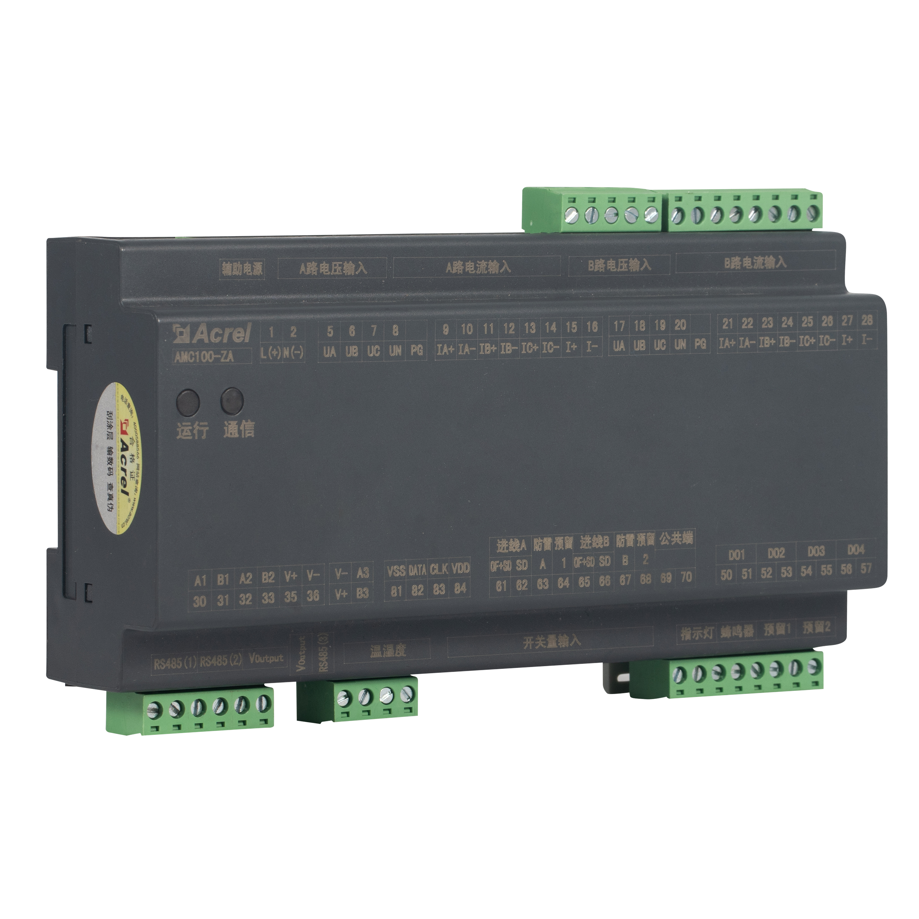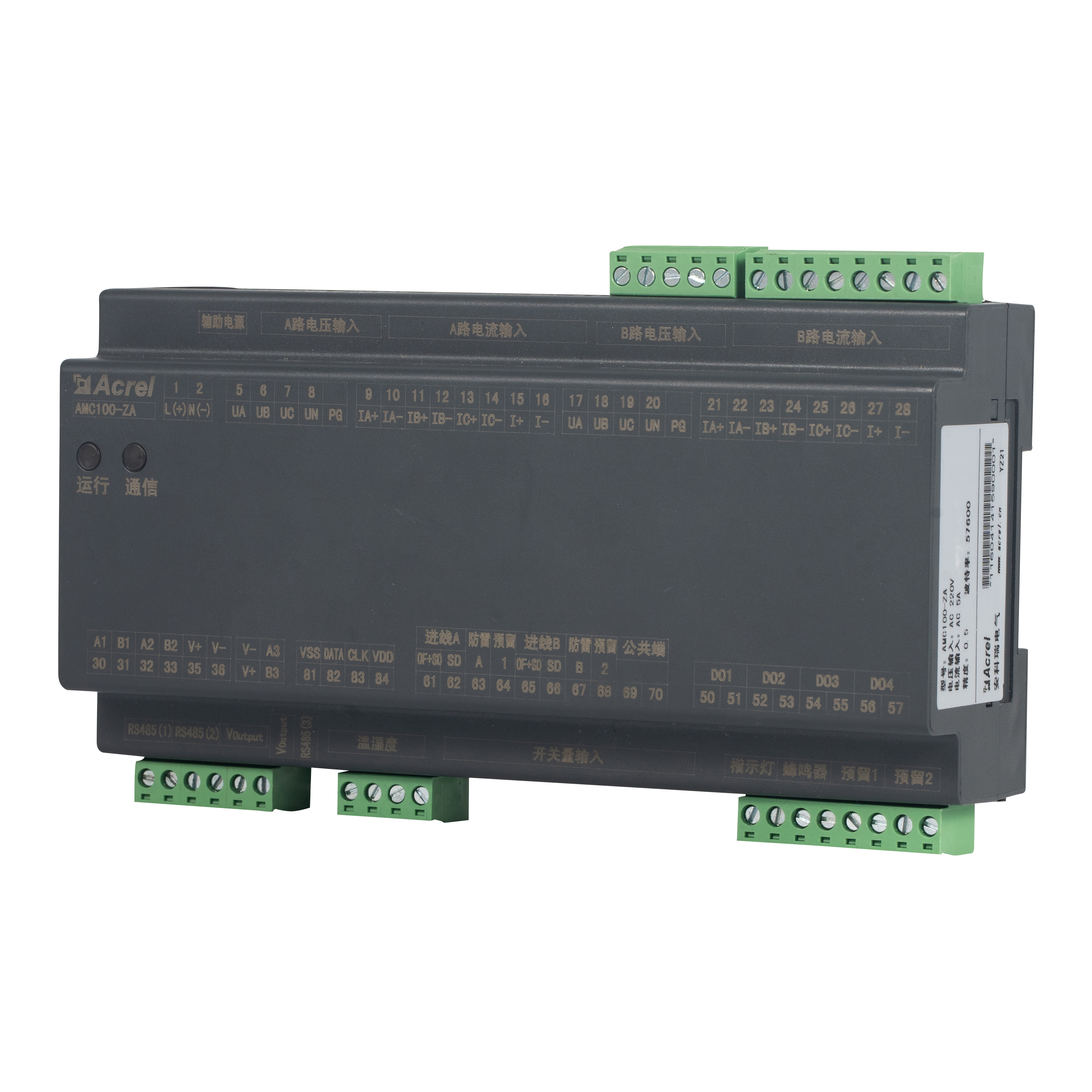 AMC100-ZA হল Acrel-এর DIN-rail AC যথার্থ পাওয়ার-ডিস্ট্রিবিউশন মনিটরিং ইউনিট যা ডেটা-সেন্টার সার্ভার র্যাকের জন্য তৈরি করা হয়েছে। এটি একই সাথে A B ডুয়াল থ্রি-ফেজ ফিড, 192টি আউটগোয়িং সার্কিট, 8টি DI / 4 DO স্ট্যাটাস পয়েন্ট, 2টি লিকেজ চ্যানেল, 1টি তাপমাত্রা-আর্দ্রতা সেন্সর এবং 63টি হারমোনিক্সের সম্পূর্ণ বৈদ্যুতিক পরামিতিগুলি ট্র্যাক করে৷ তিনটি RS485 Modbus-RTU পোর্ট বিরামহীন BMS/DCIM ইন্টিগ্রেশন সক্ষম করে। কমপ্যাক্ট 180 মিমি হাউজিং, ±0.5% নির্ভুলতা, প্রতি-চ্যানেল অ্যালার্ম থ্রেশহোল্ড এবং তাত্ক্ষণিক সাউন্ড-লাইট সতর্কতা কমিয়ে শক্তির অপচয় এবং ডাউনটাইম, এটিকে গ্রীন ডেটা-সেন্টার এসি বাসওয়ে বা PDU মনিটরিং সলিউশনের স্কেলেবল হার্টে পরিণত করে৷